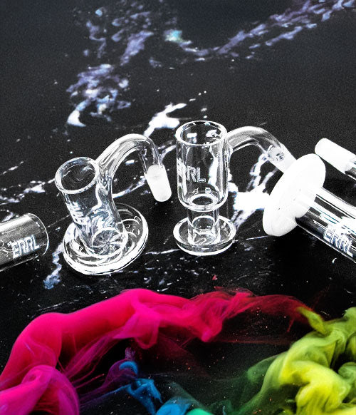 Der ERRL Blender Banger Nail ist ein einzigartig designter Quarz-Banger-Nail für Konzentrate und Öle. Er ist in den Größen 10 mm und 14 mm erhältlich und verfügt über einen Anschlusswinkel von 45° oder 90°. Er besteht aus einem stabilen Behälter im Stil eines traditionellen Terp-Slurpers und einer Scheibe an der Basis mit geschwungenen Rillen, die das Konzentrat an die richtigen Stellen leiten und für einen angenehmen Luftstrom sorgen.