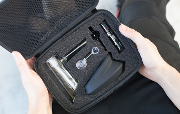 The HAMR Cold Start Dab Rig Kit by Myster is a handheld cold start rig made for use with concentrates. An all-in-one kit it streamlines a formerly complicated process by including all the essential pieces into one singular unit. The bundle includes a silicone base, slanted glass piece and quartz finger banger. It also utilizes SABR torch lighter, stainless-steel dabber and bubble cap all in a convenient zip-up carrying case.